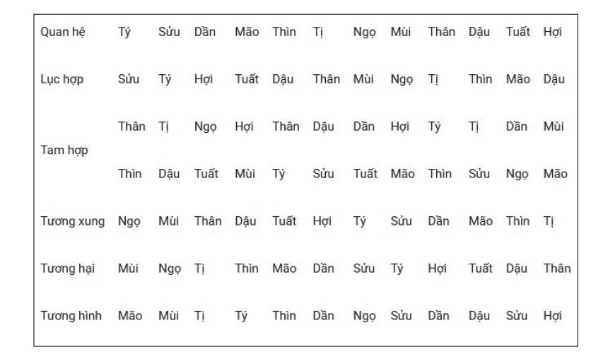 Đây là bảng tổng kết các mối quan hệ giữa mười hai con giáp với nhau để bạn có được cái nhìn tổng quan: