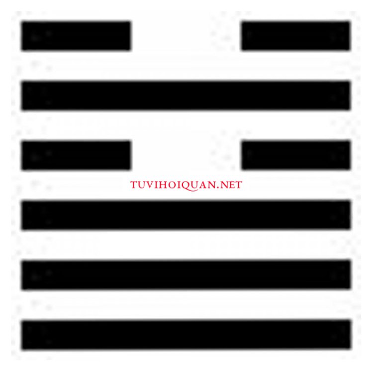 Giảng: Quẻ này nằm ở vị trí cao nhất của biểu đồ Bát Quái và được gọi là Khảm, biểu thị một điểm đặc biệt và quan trọng. Có ba đường nét dương (tượng trưng cho sự tích luỹ và hoạt động) nằm ở dưới quẻ này, trong đó đường nét số 3 là dương. Điều này cho thấy sẽ có sự xuất hiện của ba người khách, tuy nhiên, họ không đến ngay vì họ ở xa vị trí âm 6 trong biểu đồ. Do đó, chỉ có những người thẳng thắn và kiên trì mới đến được.