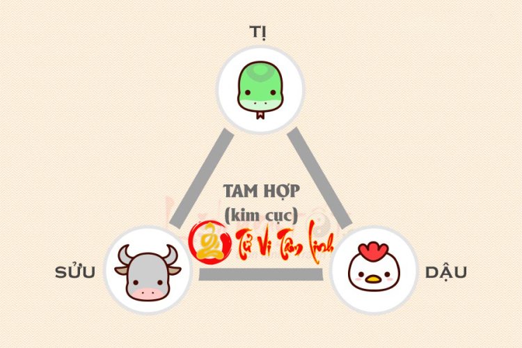 - Tam hợp Kim cục gồm có Tị, Dậu, Sửu: Khởi từ Tị Hỏa, tiến tới Dậu Kim rồi đi vào Sửu Thổ.