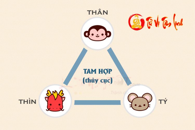 - Tam hợp Thủy cục gồm có Thân, Tý, Thìn: Khởi từ Thân Kim, tiến tới Tý Thủy rồi đi vào Thìn Thổ.