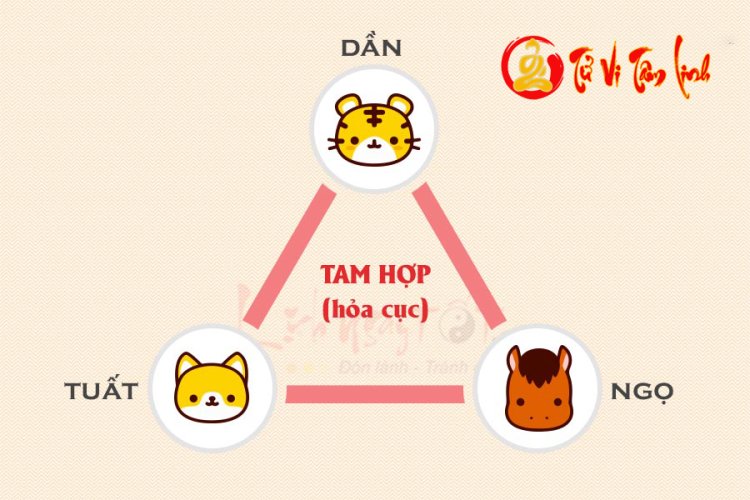 Theo ngũ hành, Tuất thuộc hành Thổ, Dần thuộc hành Mộc, Mộc kiểm soát Thổ. Trong trường hợp này, Dần chiếm ưu thế và luôn nắm quyền kiểm soát. Điều quan trọng là khi kết hợp với Tuất, tính hung hăng của Dần dịu bớt, còn Tuất luôn vui vẻ trong vai trò của mình. Vậy mới nói, một khi đã hiểu được Tam hợp là gì, các tuổi sẽ biết cách hành xử khéo léo hơn để dễ dàng có được cuộc sống vui vẻ, ngày càng thịnh vượng hơn.