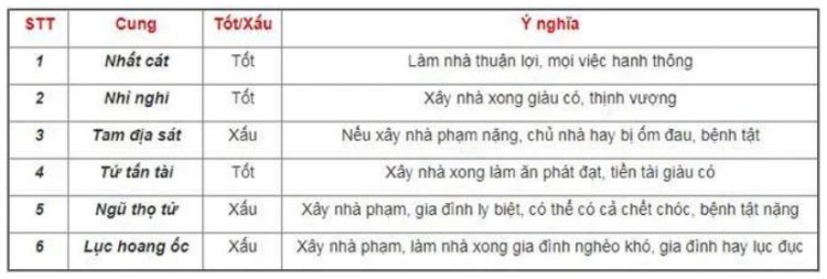 Trường hợp tuổi của gia chủ rơi vào các cung: Nhất cát, Nhì Nghi và Tứ tấn tài thì sẽ thuận cho việc làm nhà. Còn ngược lại, rơi vào các cung Tam địa sát, Ngũ thọ tử và Lục hoang ốc là những cung xấu, chủ nhà nên kiêng kị việc xây nhà.
