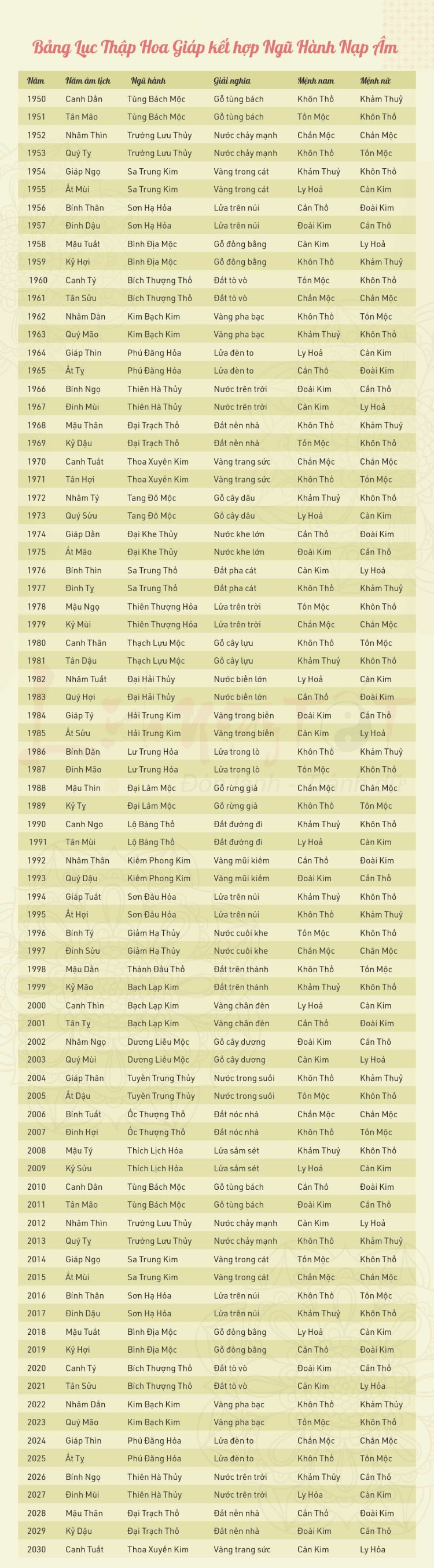 Để biết mình hay đối phương mệnh ngũ hành là gì, tra ngay bảng sau: